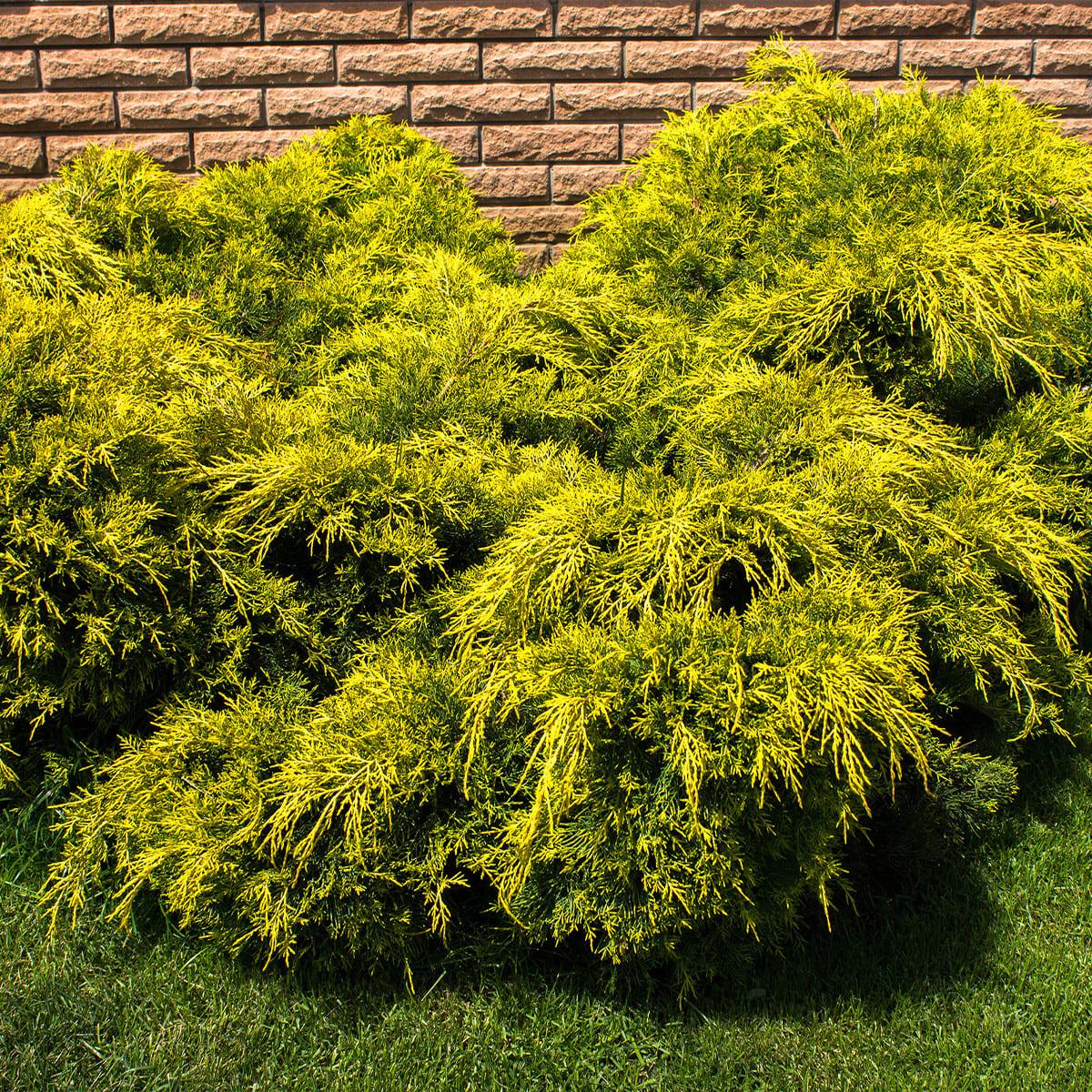 Величественный куст вырастает до 3 м в высоту, формируя крону диаметром около 5 м. Ветви крупные, мощные, дуговидной формы. От основания восходят вверх, повисая на конца. Побеги покрыты насыщенной зеленой хвоей с белой полоской изнутри. На старых ветвях она игловидная, а на отросших – чешуевидная. Крупномер китайский Pfitzeriana Aurea используют для оформления склонов, также он органично смотрится в саду в качестве солитера или в групповых посадках в формировании живой изгороди.