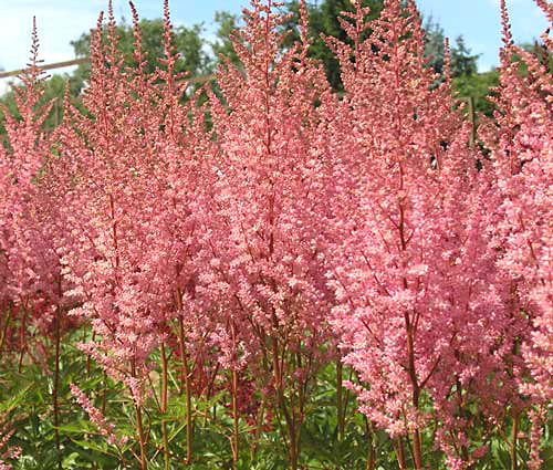 Саженцы астильбы Erika понравятся ценителям большим и пышных декоративных растений, которые характеризуется сильным ростом и неприхотливостью в уходе. В июле расцветают лососево-розовые метельчатые соцветия средней плотности. Их длина достигает 25 см, а диаметр – 10 см. Высота цветоносов достигает 80 см.
