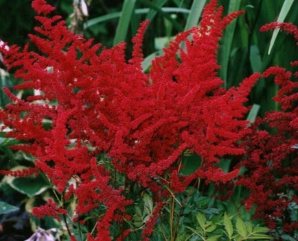 Астильба Арендса Glut - сильнорослый (до 85 см) сорт. Листья высотой - 35 см, весной буровато-красные, черешки и жилки коричневые. Соцветие ярко-карминно-красное на красноватой оси, средней плотности, длиной 35 см, метельчатое. Пыльники синеватые, тычиночные нити, пестики и чашелистики красные.