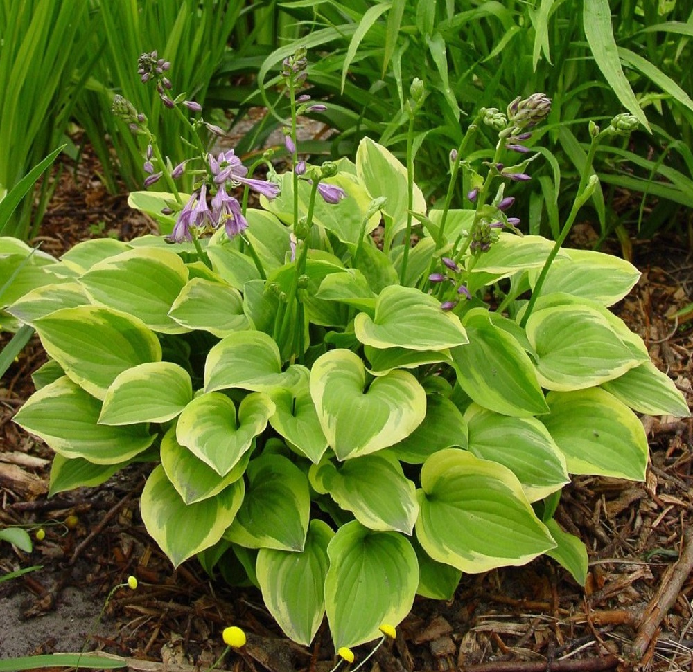 Хоста гибридная Голден Тиара быстро разрастается, благодаря чему ее можно использовать в качестве почвопокровника. Широкие куртины состоят из плотных светло-зеленых листьев края которых имеют желтую окантовку. Этот сорт отлично смотрится в качестве одиночных посадок, гармонично вписывается в смешанные композиции, используется для декорирования альпинариев и водоемов.