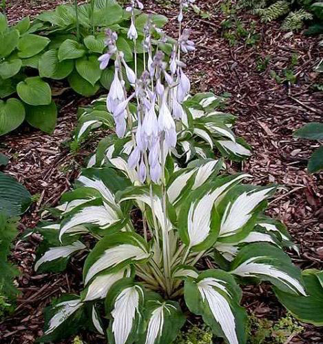 Хоста Christmаs Sоng – декоративное многолетнее растение среднего размера, обычно достигающее полуметра в высоту. Ее большие, выразительные листья, окрашенные в несколько различных цветов, заставляют залюбоваться. Узкий белый центр в виде язычков пламени резко выделяется на темно-зеленом фоне листовой пластины. В середине лета на длинных прямых цветоносах появляются бледно-лавандовые воронковидные цветки. Этот сильный здоровый гибридный сорт особенно хорош в одиночных посадках на газоне, но также подходит и для смешанных групп. Многолетник любит утреннее солнце и легкую тень, неприхотлив и устойчив к вредителям.