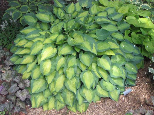 Хоста Swееt Hоmе Сhiсаgо – декоративный куст средних размеров, достигающий в высоту до 40 см, с рифлеными, овальными листьями. Собранные в аккуратные прикорневые розетки, они образуют плотные куртины с потрясающе красивой окраской ребристых листьев, у которых желто-зеленый фон контрастирует с темно-зеленой каймой. В зависимости от сезона интенсивность окраски листовой пластины может изменяться от зеленовато-желтой до шартрезной. Сорт очень декоративный, поэтому растение будет эффектно выглядеть в любом месте. Но предпочтительнее высаживать его на газоны, около водоемов или на рабатки вдоль дорожек.